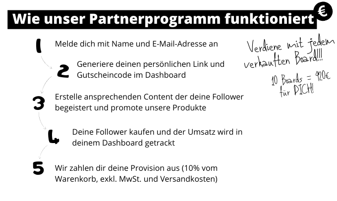 Du erhältst 10% Provision auf den gesamten Verkaufserlös (exkl. MwSt. und Versandkosten) wenn ein Kunde über deinen Affiliate Link kauft oder deinen persönlichen Gutscheincode nutzt.
